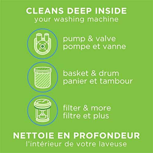 Helps remove odour-causing residues and grime. Cleans deep inside pump, valve, tub, drum, agitator, filter and hose