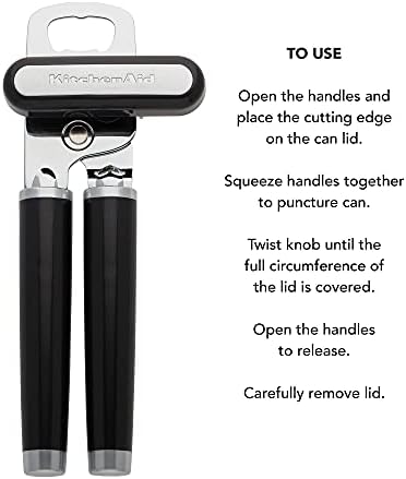 The KitchenAid can opener is an essential gadget for any kitchen. The can opener’s large, easy-to-turn knob makes opening cans an easy task. The can opener features a sharp, 420 J2 stainless steel cutting wheel and an integrated bottle opener built into the head. This can opener is durable and comes with ergonomic handles to provide a sure grip when in use. It has glossy ABS handles, ABS satin chrome plated bolsters and endcaps, as well as an ABS satin chrome plated badge. Hand wash with warm water and a mild detergent, Rinse and dry immediately. One year hassle-free replacement and lifetime limited.